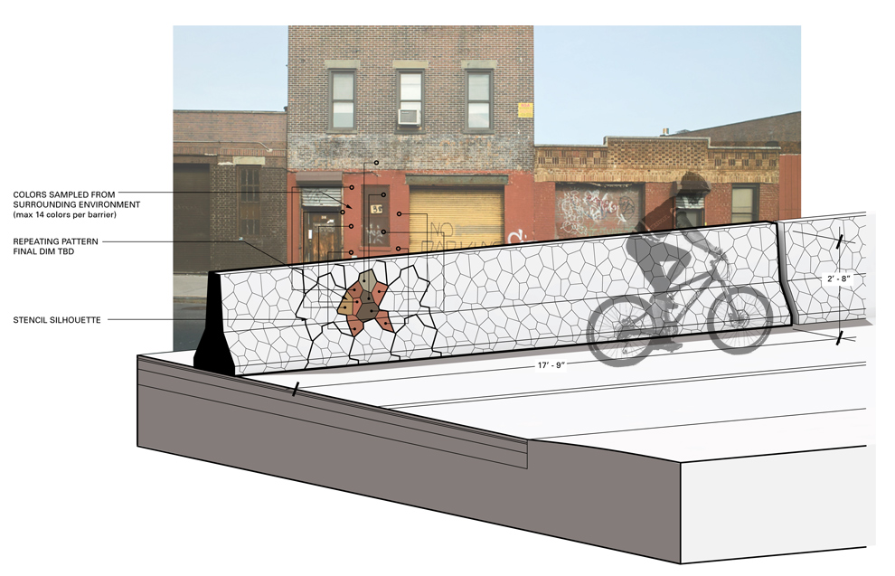 The design will be quick to apply. Using only a limited color palette and a repeating stencil system, we will be able to economically create a bold, colorful graphic statement that will encourage all those that walk, bike, and run by the barrier to think about and interact with their great city.