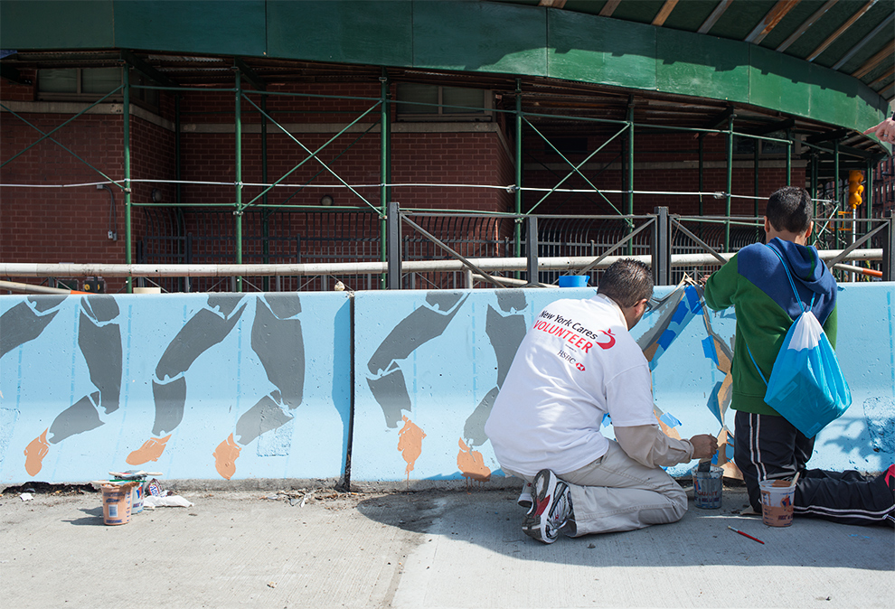 My design for “Singing in the Rain” was commissioned by the NYC DOT as part of the Urban Art program to Beautify Barriers throughout the city. The site is located just South of the theater district and Times Square at 36th St and 9th Ave in Manhattan, and references musicals – especially one in particular – as well as motion, animation and street rhythm. The piece will be up for 1 year and made use of a series of movable stencils of figures with articulated joints to allow for variation in the 200′ barrier length. 20 awesome volunteers of all ages participating in the NYC Cares program (many who had never picked up a paintbrush before) were able to arrange the stencils and finish painting the design in 4 hours based off of a series of detailed instruction sheets.