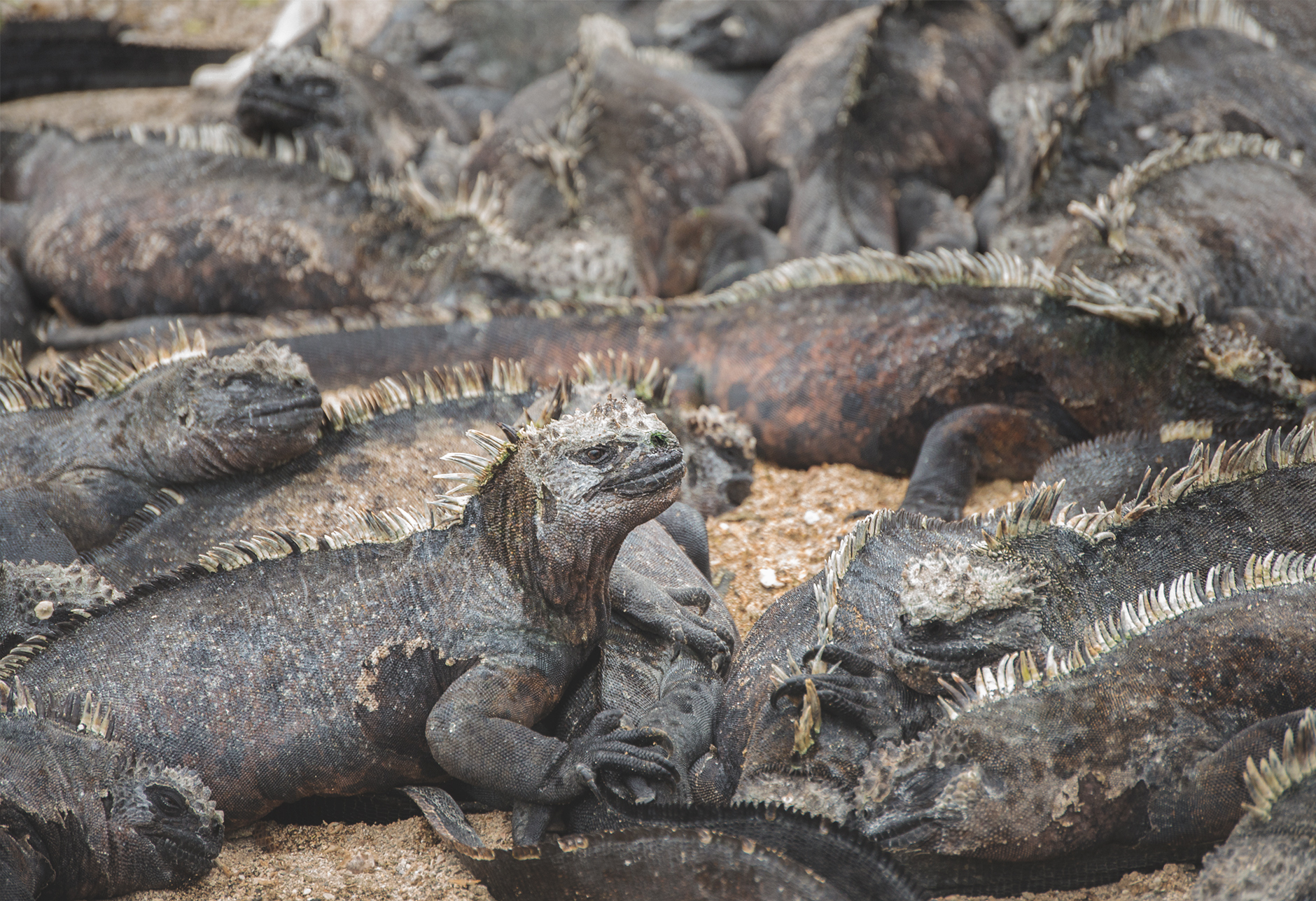 Millions of years ago a regular South American land iguana floated the 600 miles of ocean waters to the Galapagos Islands aboard debris or driftwood. From that species emerged two distinct types, the Galapagos Marine Iguana and the Galapagos Land Iguana. Darwin called the marine version “hideous looking…clumsy lizards” and the little godzillas manage to convey a gentle malevolence that belies their carefully tuned and incredible evolutionary adaptations. They became marine reptiles, exclusively feasting on underwater algae and seawater during the morning, warming themselves on the lava rocks the rest of the day. Their long claws give them purchase on the craggy underwater rocks during fierce underwater tides, while their spiky dorsal extrusions – coupled with their flattened, narrow tails – allow them to gracefully glide underwater. While their dark complexion is designed to better absorb the sun’s rays after a dive in the frigid waters. Even their stubby face is tuned, allowing them to quickly bite off algae with a series of sharp teeth on either side of their face. Prompt meals are a must, after 10 minutes of diving in cold Galapagos waters, their muscles will lock-up. But the best part is the unique nasal glands that allow them to expel the salt that gets ingested into their blood during underwater meals and produces what sounds like a sneeze followed by a torrent of salt water ejected from their nasal cavity. The salt blowing out of their noses gives them a distinct white coloration on the top of their heads. Imagine a field of the laconic, sluggish monsters slowly warming up on the rocky shore, silent except for the regular punctuations of streams of saltwater sneezes blasting themselves and their jumbled up neighbors. No question, they were my favorite.